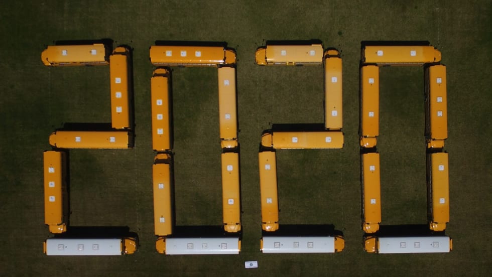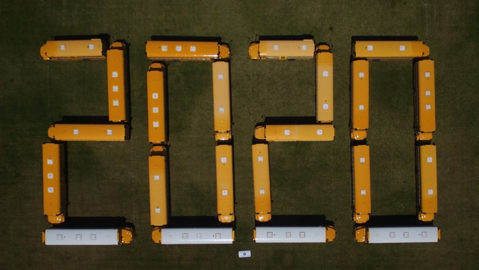 A First Student location in New Hampshire and districts in Washington and California are among those using school buses to form “2020” in honor of seniors, who cannot take part in a traditional ceremony due to the COVID-19 pandemic.