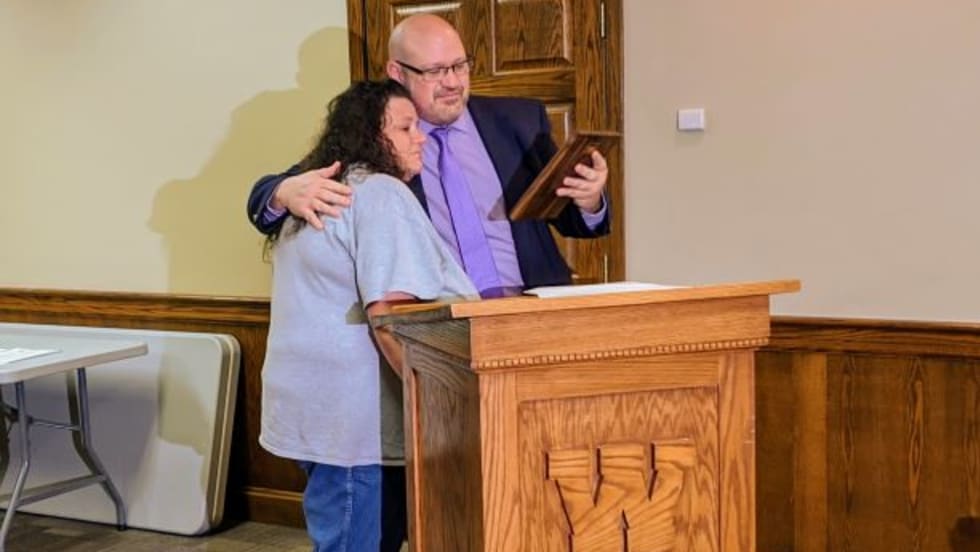 Katrina Self of Ohio is recognized with a plaque for putting her training to good use by reviving the child of a parent on her route.