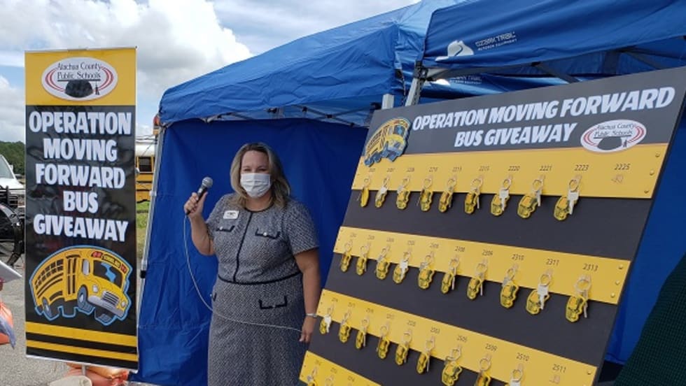 Alachua County Public Schools makes the donation as part of a new initiative to repurpose its retiring buses, which it typically auctions off.