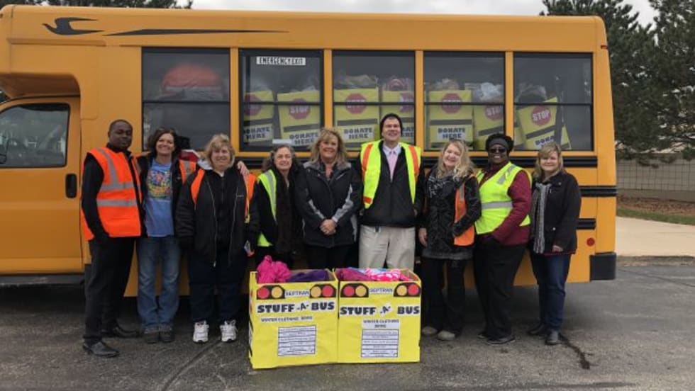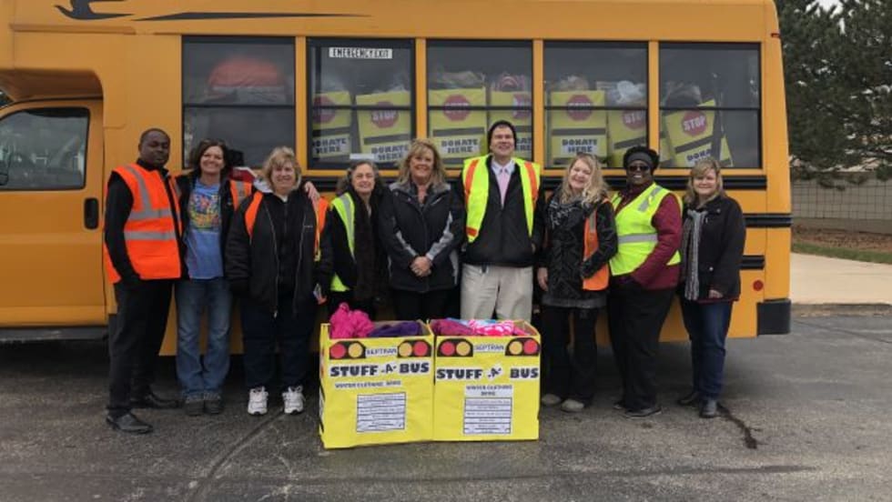 Septran employees create school bus-shaped donation boxes and drop them off at every school in the community to collect winter clothing for those in need.