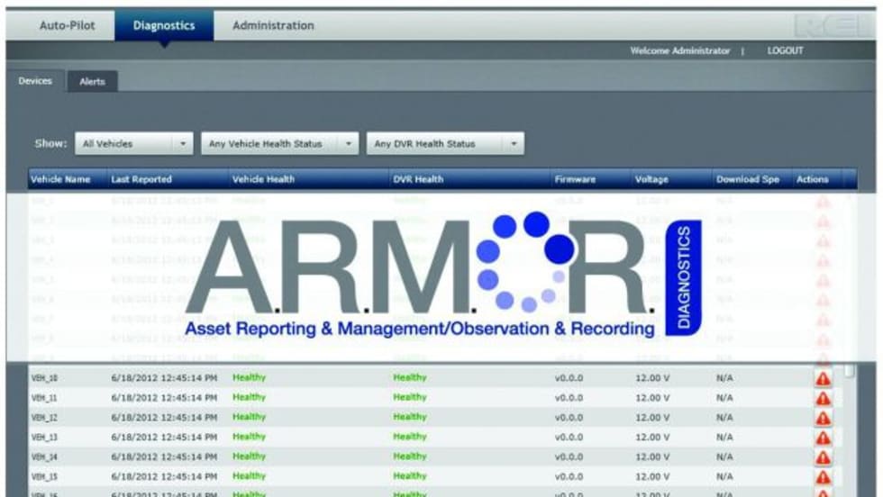 A.R.M.O.R.-Auto Pilot manages wireless downloading, reporting and automated notification of video events as defined by the user, and A.R.M.O.R.-Diagnostics is a vehicle, DVR and camera diagnostics software tool.