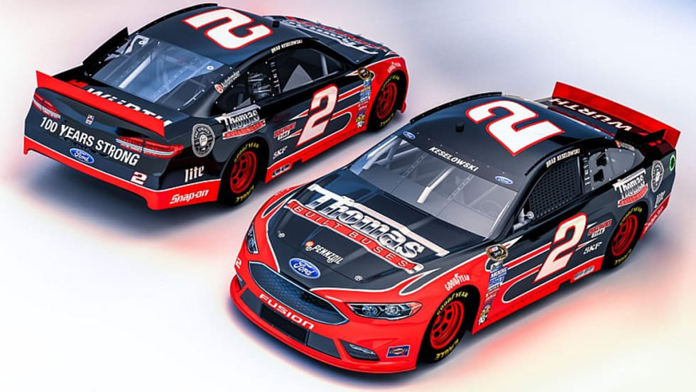 In honor of its 100th anniversary, Thomas Built Buses sponsors Brad Keselowski as he drives the No. 2 Thomas Built Buses Ford Fusion in the Toyota Owners 400.