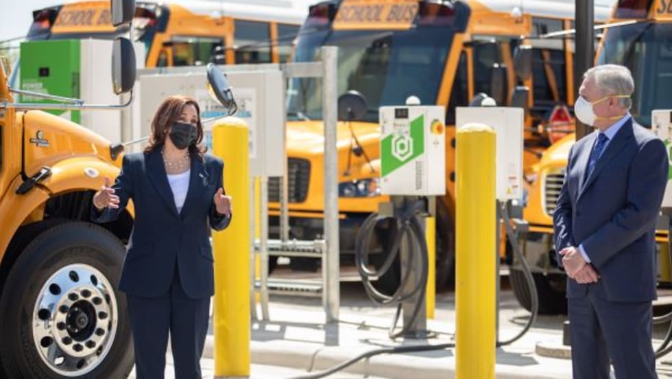 Harris meets with school bus manufacturer employees and parent company Daimler Trucks North America CEO, who detail the benefits of electric buses. Daimler also inaugurates its Electric Island vehicle charging station.