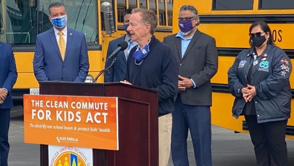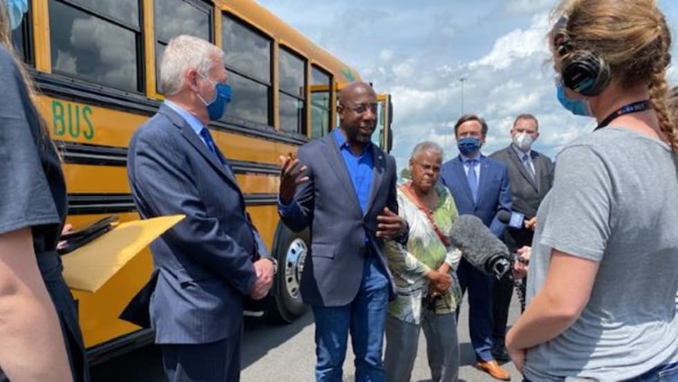 Sen. Raphael Warnock (Ga.) learns more about the alt-fuel buses and goes on a ride-and-drive. The visit follows his co-introduction of legislation that would invest $25 billion in electric school buses.