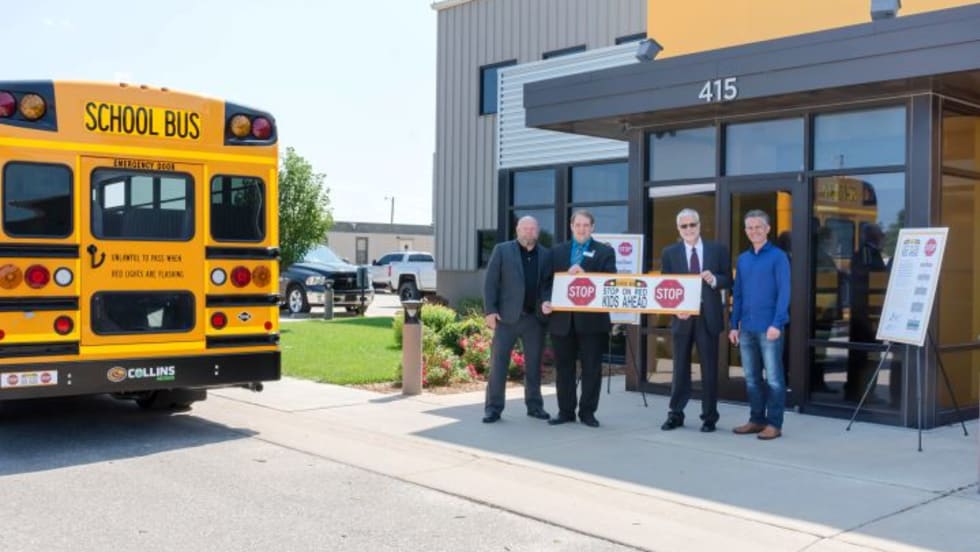 The state Department of Education’s “Stop on Red, Kids Ahead” includes social media reminders, posters, and safety flyers, as well as bumper stickers donated by Collins Bus Corp.