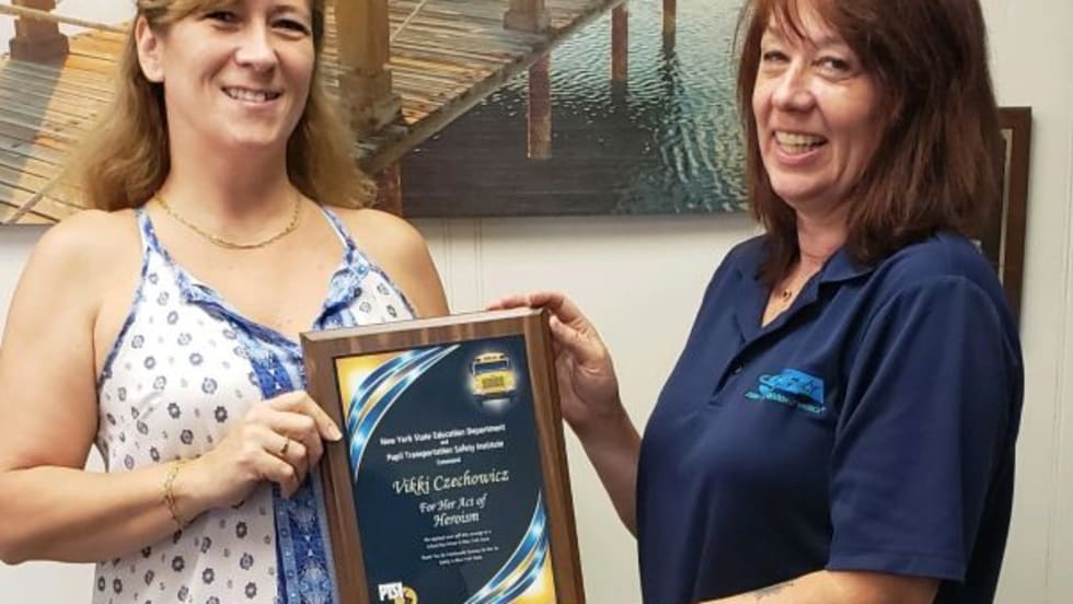 Vikki Boyce Czechowicz of New York notices smoke coming from the under dashboard, evacuates the 19 students aboard her bus right before the engine area catches fire. She is presented with a Heroism Award.