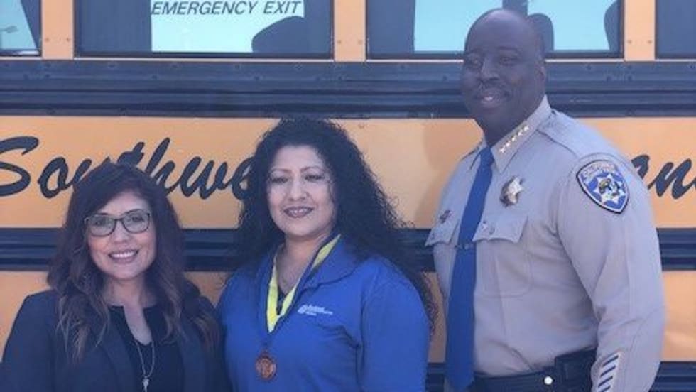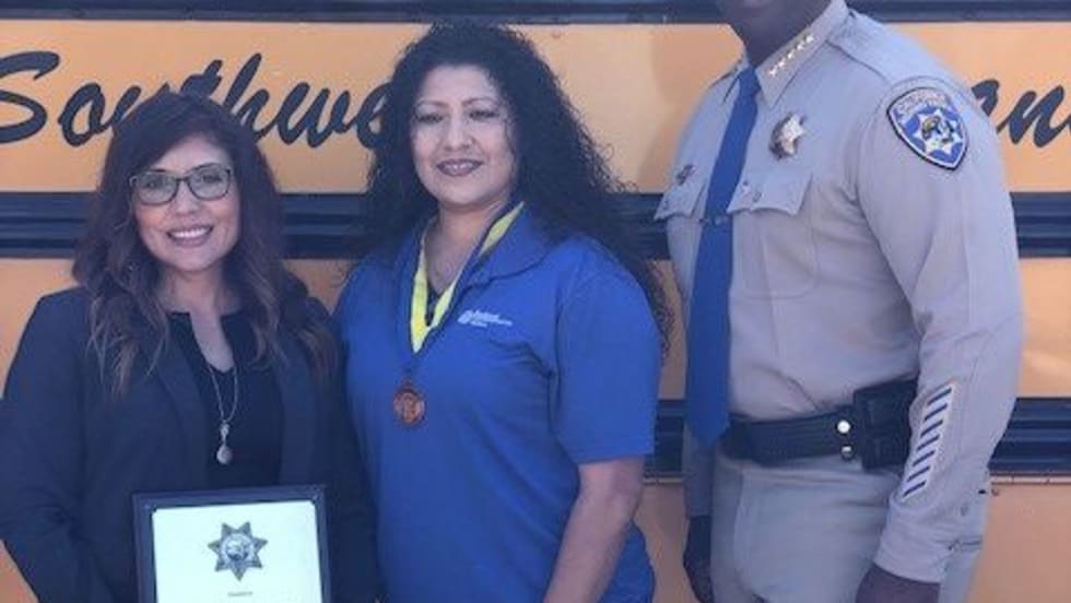 Salena Torres is given the North Region School Bus Driver of the Year award by the California Highway Patrol and the California Department of Education for the November incident.