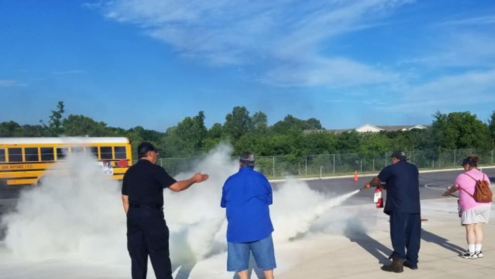 Drivers and other employees rotate through 10 stations that include live fires for fire extinguisher training, evacuation of smoke-filled buses, CPR, and first aid.