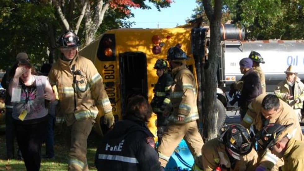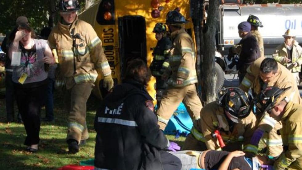 The full-scale exercise simulating an accident involving a school bus tested regional emergency response with personnel from seven area towns participating.