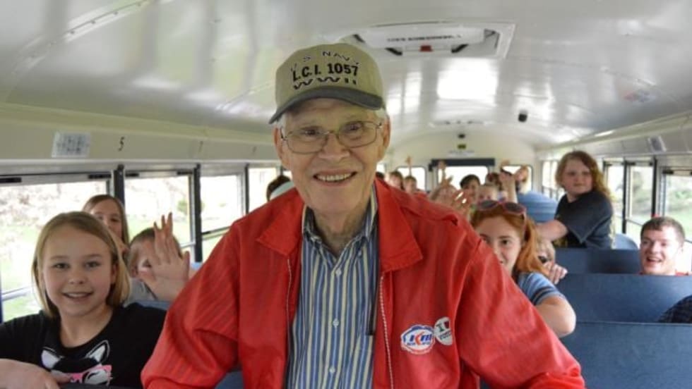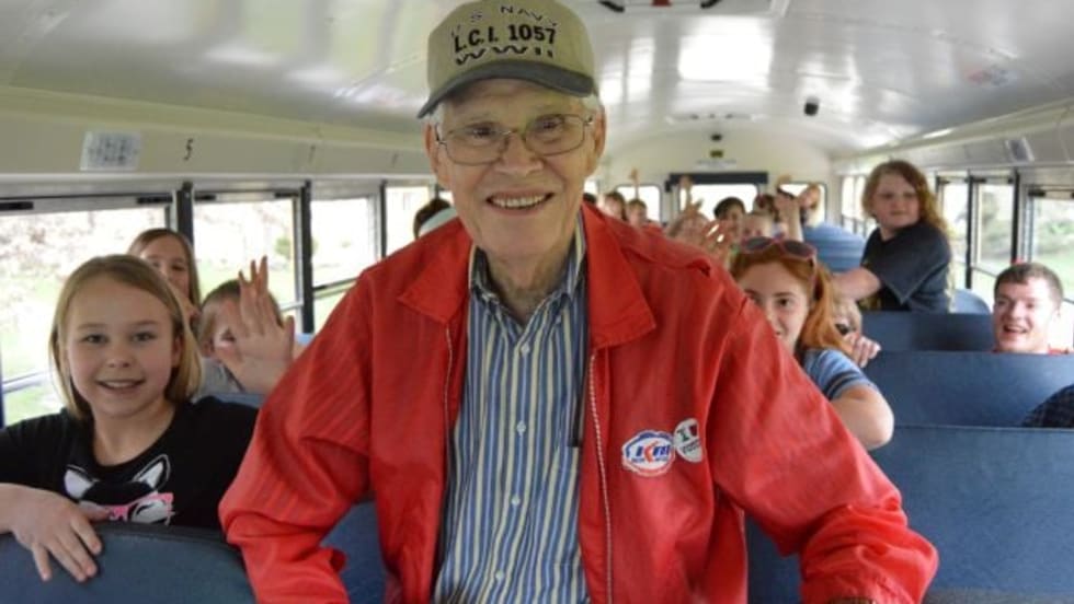 Roger Timmons was excited for his first ride on a school bus on Monday — at 90 years old. The World War II veteran never got to ride a yellow bus as a kid.
