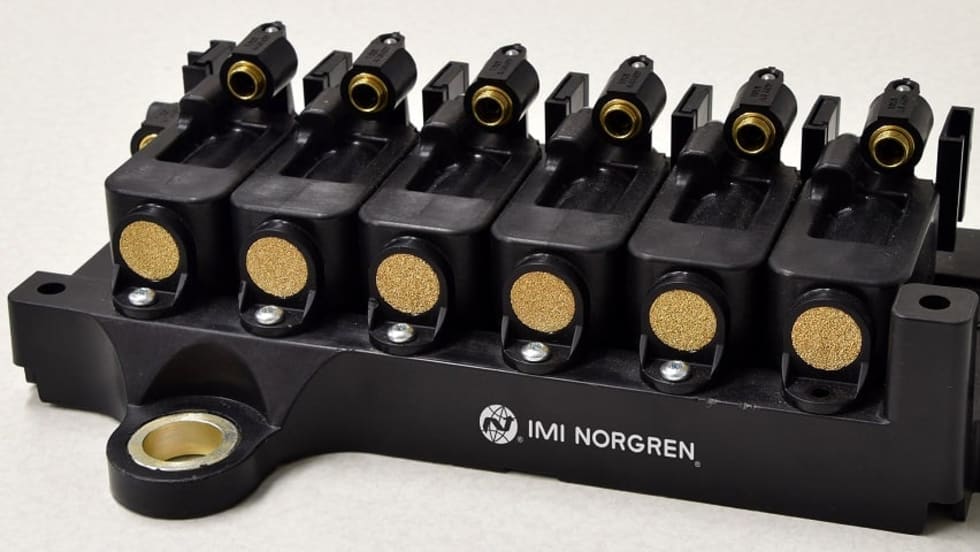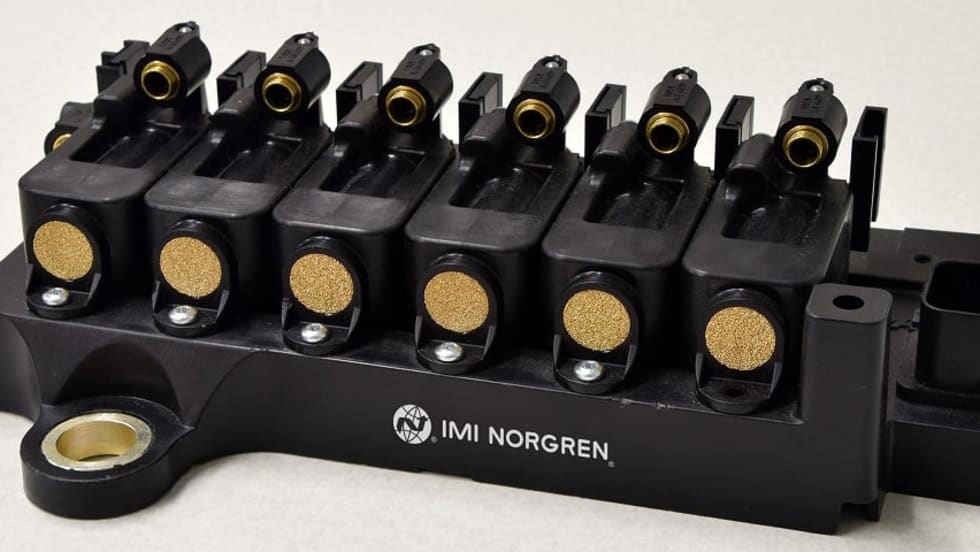 The Latching Solenoid Valve Array can be used for on-vehicle applications such as on-chassis field expansions with no additional wiring or air supply.