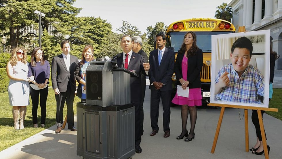 Gov. Jerry Brown signs SB 1072, also known as the “Paul Lee School Bus Safety Law,” which will require all school buses in the state to be equipped with child-check reminder alarm systems and for bus drivers to be trained on those systems.