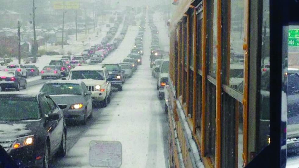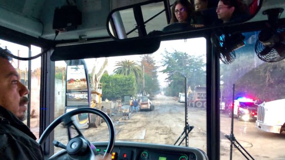Carpinteria (Calif.) Unified School District school bus drivers transport critical personnel for their district and the area, traversing a wet, muddy section of Highway 101.