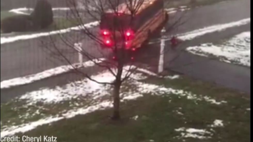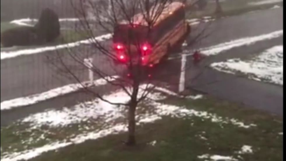 The Massachusetts school bus is shown on video sliding backward, hitting a mailbox, and coming to rest after hitting a car. No one was hurt.