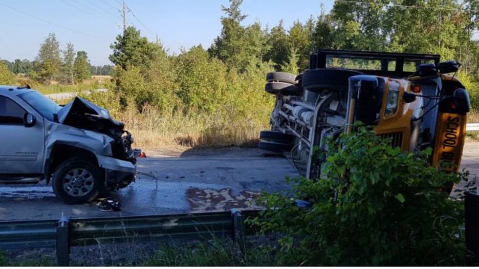 Police find that the school bus driver failed to stop at a stop sign before colliding with a pickup truck. Three students sustain serious injuries.