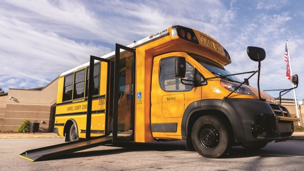 Collins Bus Corp.’s Low-Floor Bus features a ramp that enables faster, lift-free boarding for students in wheelchairs. Customers report increased comfort and empowerment through the ability to board with and sit near other students.