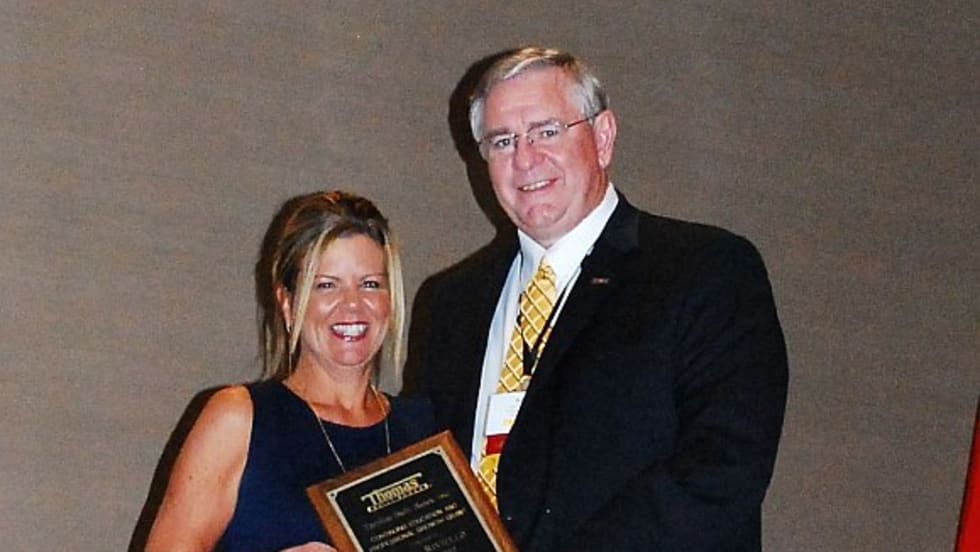 Patty Riviello, The Trans Group’s vice president of human resources, wins the Thomas Built Buses Continuing Education Award. The $2,500 grant is presented annually to an employee of a contractor.