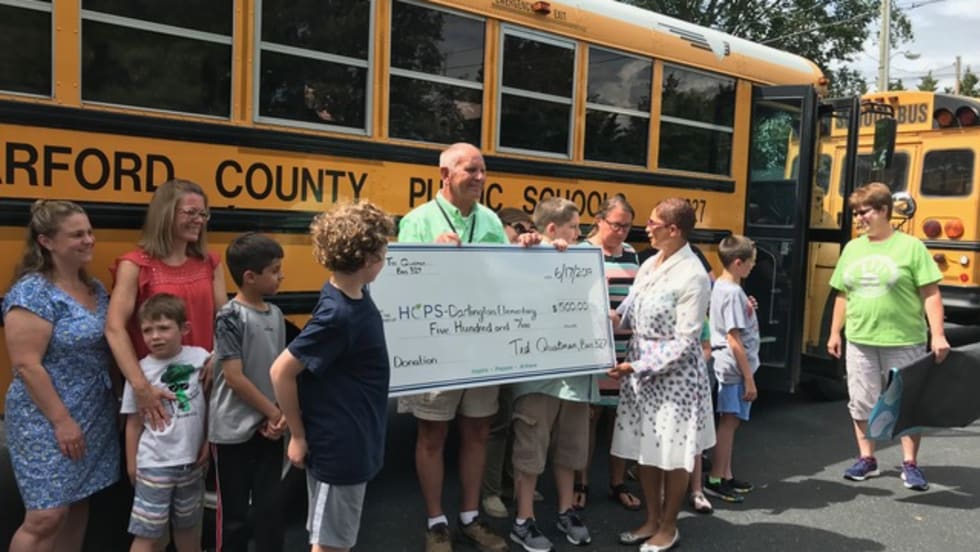 Ted Quatman of Maryland donates his $500 early retirement incentive to Harford County Public Schools' autism program after driving for nine years.