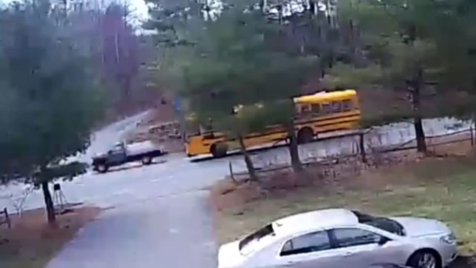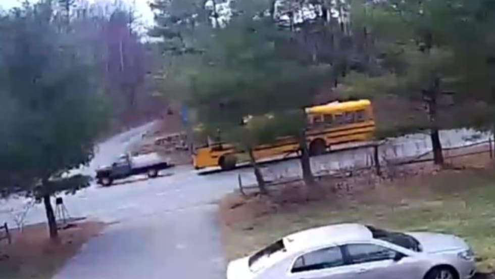 In Massachusetts, a truck drives by a stopped bus on the right before students disembark. Police are working to identify the offender.