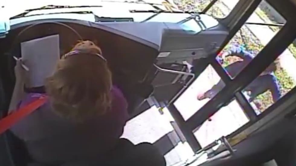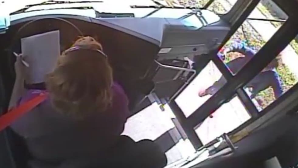 In an apparent road rage incident, police say, a motorist stops in front of the bus and cracks a glass panel on the door when the bus driver won’t open it.