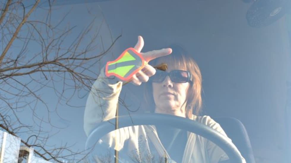 The STEFFI Crossing Enhancer is designed to be worn on the back of a driver’s hand, and it comprises a gray reflective arrow on a bright yellow background with an orange border. Victoria DeCarlo, who developed the product, tells SBF that it can be worn on a bare hand or over a glove, and that its colors and arrow are highly visible through the windshield of a school bus, and from a distance.