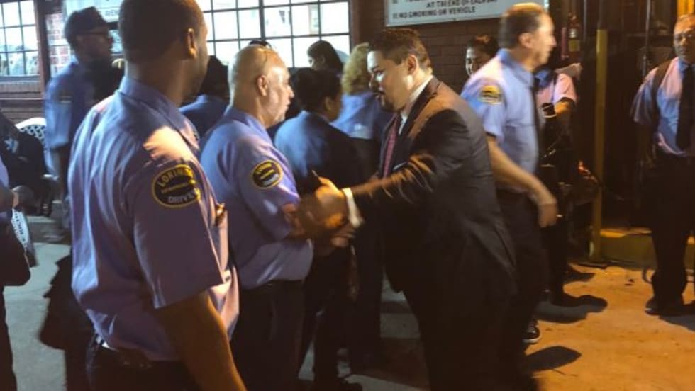 As one of several visits on the first day of school, Richard Carranza greets Logan Bus Co. drivers at the company’s headquarters.