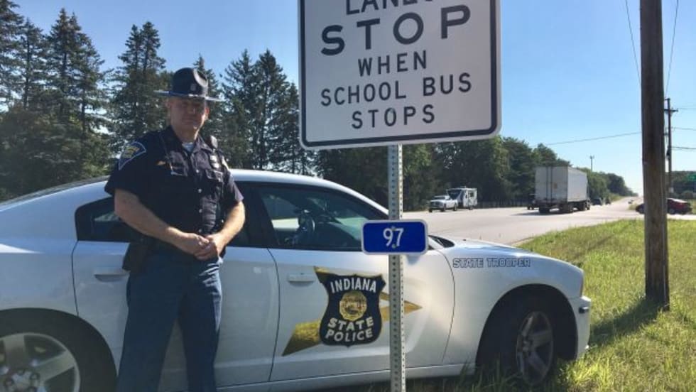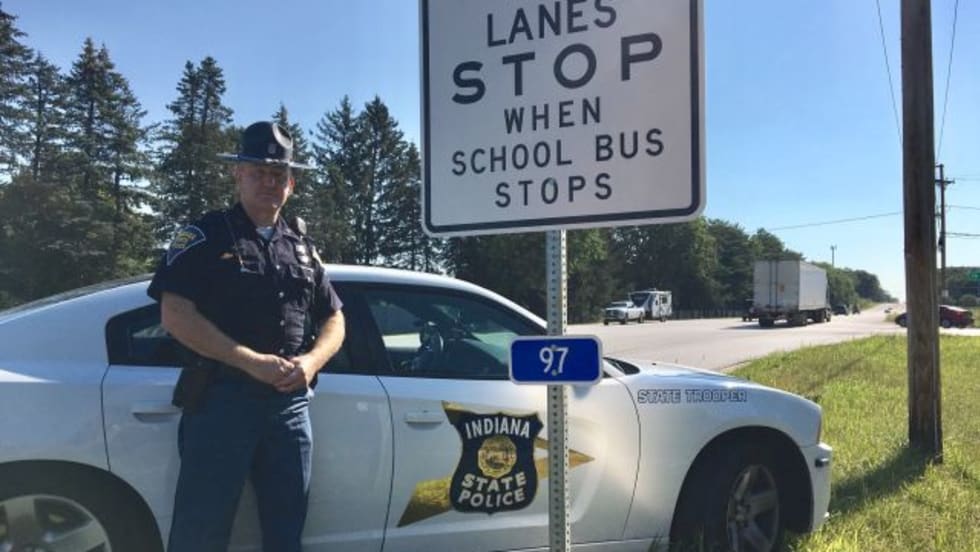 Jim Zeser of the Indiana State Police lobbies for road signs that alert drivers to stop for school buses.