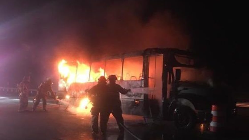 The rear tire of the bus, owned by Illinois-based Herscher Christian Church, catches fire. The teenagers and adults on board are able to exit unharmed as the fire quickly spreads.