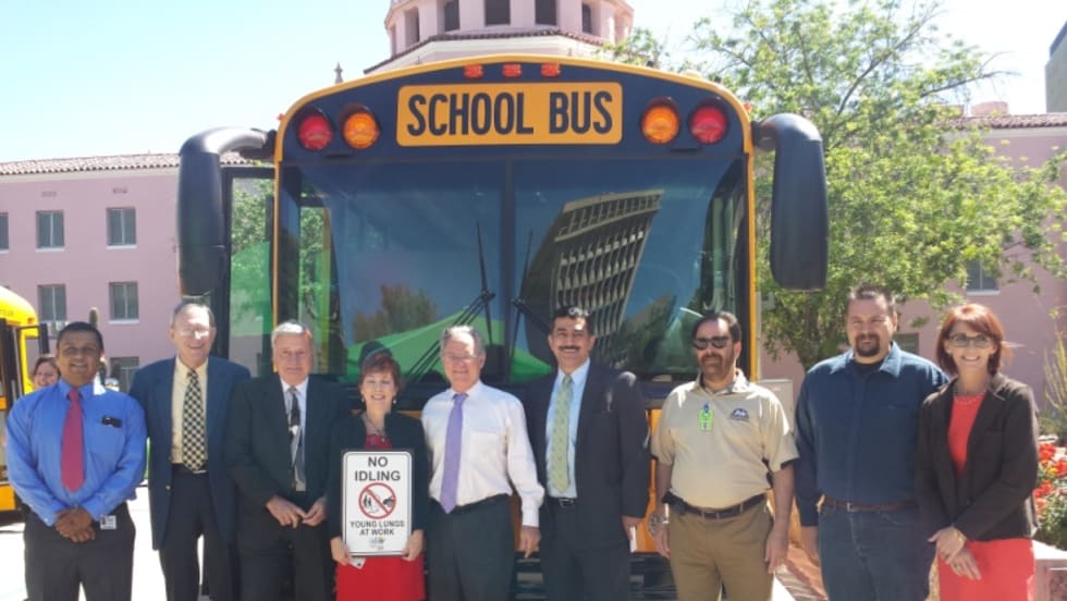 The event on April 16 featured two new alternative-fuel Thomas Built buses to celebrate grant awards for the upfit of 15 buses for the school districts.