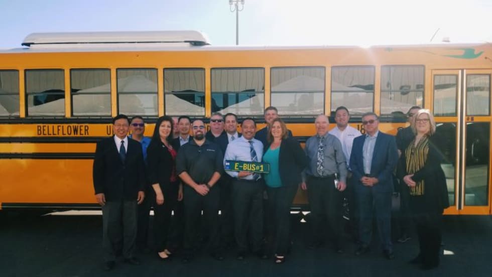 Bellflower Unified School District displays the two new Blue Bird Type D All American Rear Engine Electric school buses it received in September.