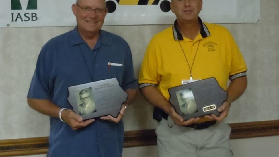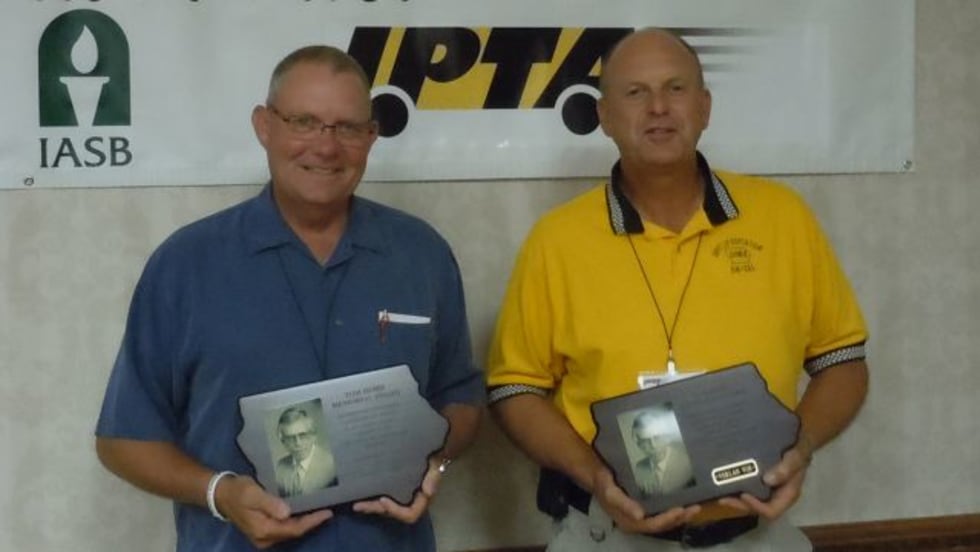 Owen Freese and Verlan Vos, who have both been inspecting Iowa’s school buses for 13 years, receive the prestigious Tom Horn Memorial Award. Though they initially encountered suspicion and anger when they started scrutinizing fleets, state pupil transportation director Max Christensen says that they persevered and have become "the best delegates of good will" in their agency.