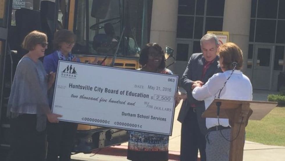The school bus contractor gives the bus and a $2,500 check to Huntsville (Ala.) City Schools to help provide free meals for children during the summer.