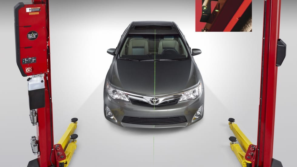 The Spotline laser vehicle spotting guide projects a green laser line directly in the center of the bay. The technician centers the line on the vehicle hood and dash while pulling in for accurate positioning.