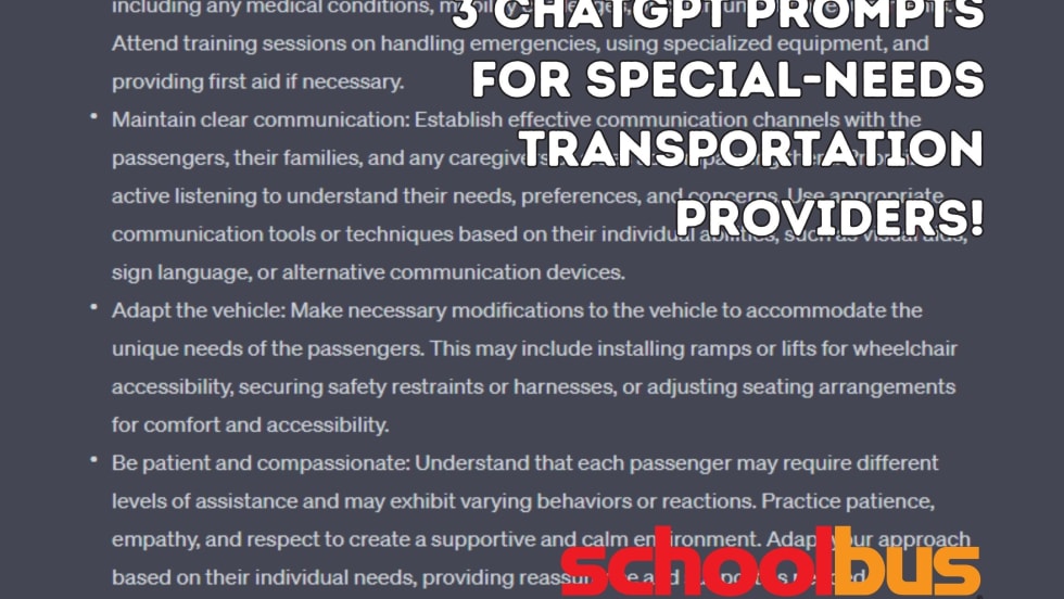Could AI prompts revolutionize school transportation operations? From efficient bus fleet routing to managing student behavior and emergency planning, see how AI-powered assistance might transform the way professionals navigate their crucial responsibilities.