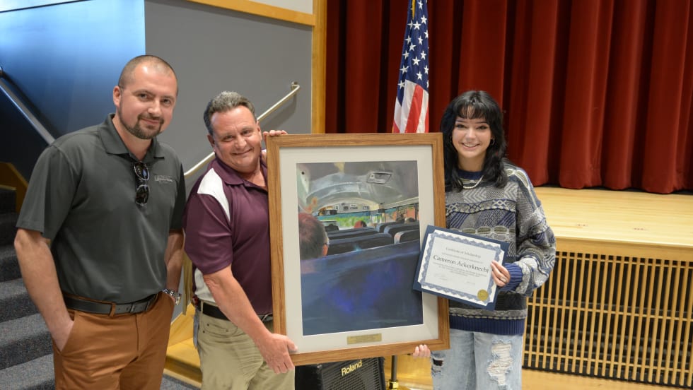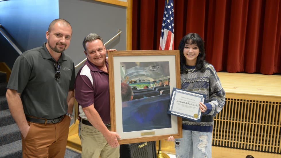 High school senior Cameron Ackerknecht earned a $1,000 scholarship toward her education at State University of New York at New Paltz for her acrylic painting in Leonard Bus Sales' annual contest.