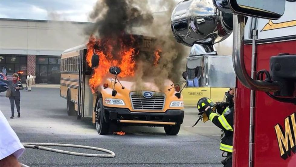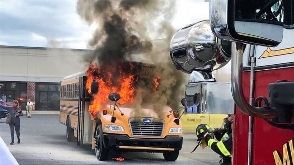 The bus driver notices smoke coming from the engine compartment while unloading students and evacuates them. No one is on the bus when it catches fire.