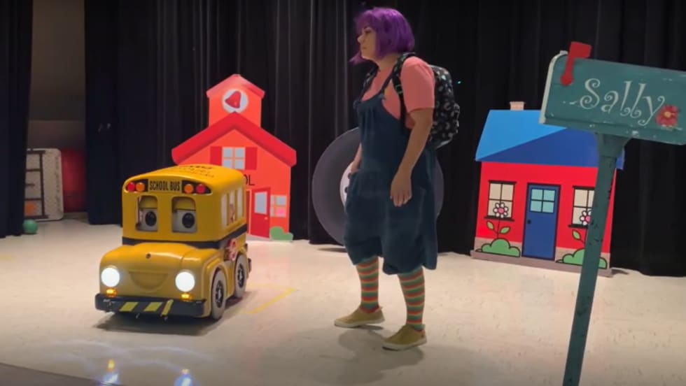 Bus drivers from Calcasieu Parish (La.) Schools put on a skit with Buster the Bus for students during National School Bus Safety Week.