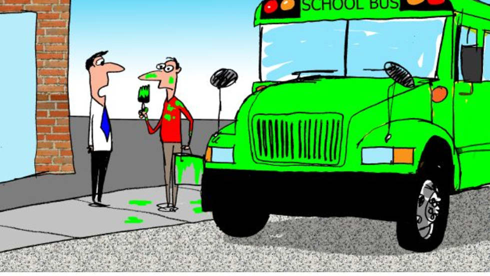 SBF’s monthly “BUSting Up” cartoon targets the humorous side of pupil transportation. The June through December 2017 entries cover “green” buses, budget woes, and a giant stop arm.