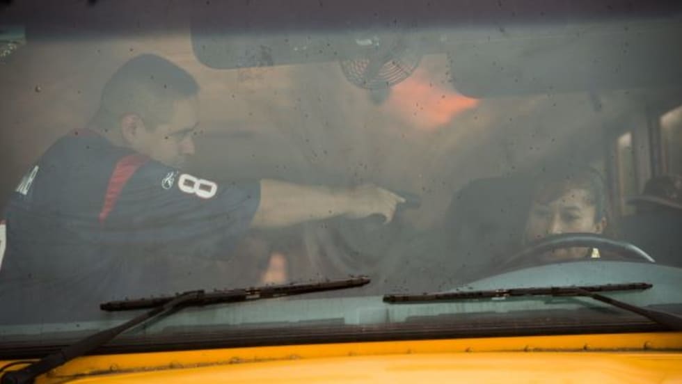 A man with a rifle allegedly forces his way onto a bus at a bus stop, orders the driver to drive the bus, then kicks him and the 18 students off and drives the bus before abandoning it. The driver is credited for de-escalating the situation.