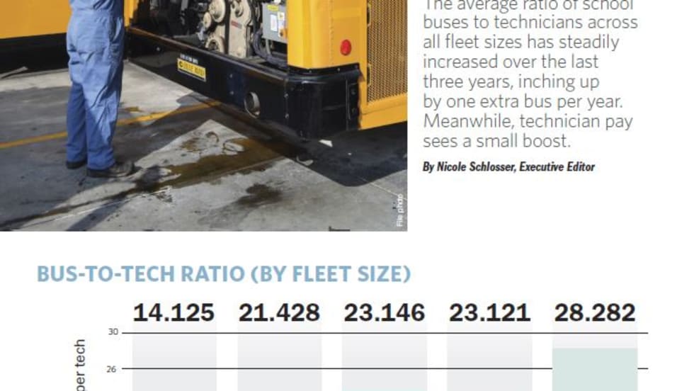 SBF's Maintenance Survey finds that the average ratio of school buses to technicians across all fleet sizes has steadily increased over the last three years, inching up by one extra bus per year. Meanwhile, technician pay sees a small boost.
