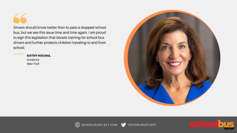 The legislation signed by Gov. Kathy Hochul uses a portion of fines for illegal passing of stopped buses to fund training for school bus drivers and motorists.