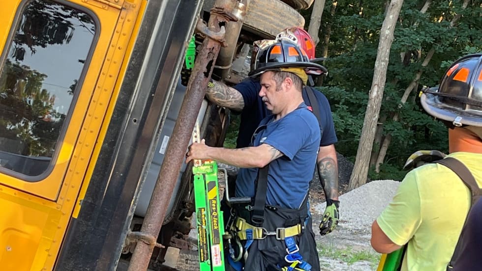 The school bus was used to train firefighters in a simulation of a victim trapped under the vehicle.